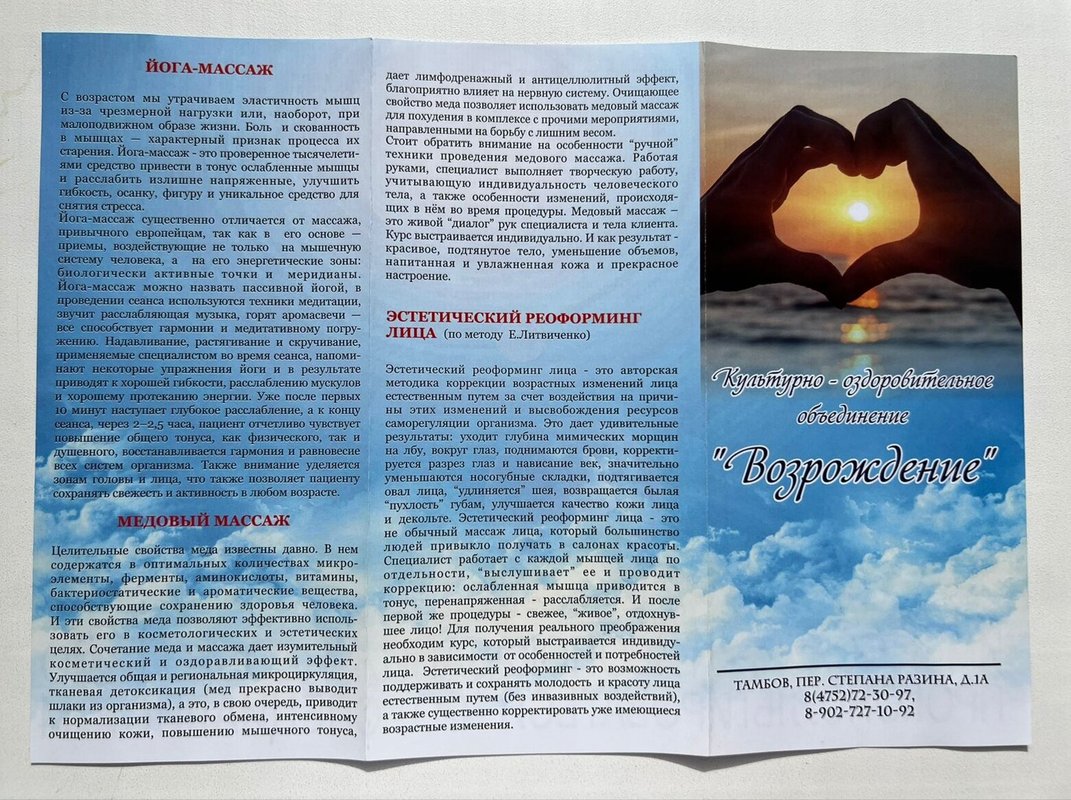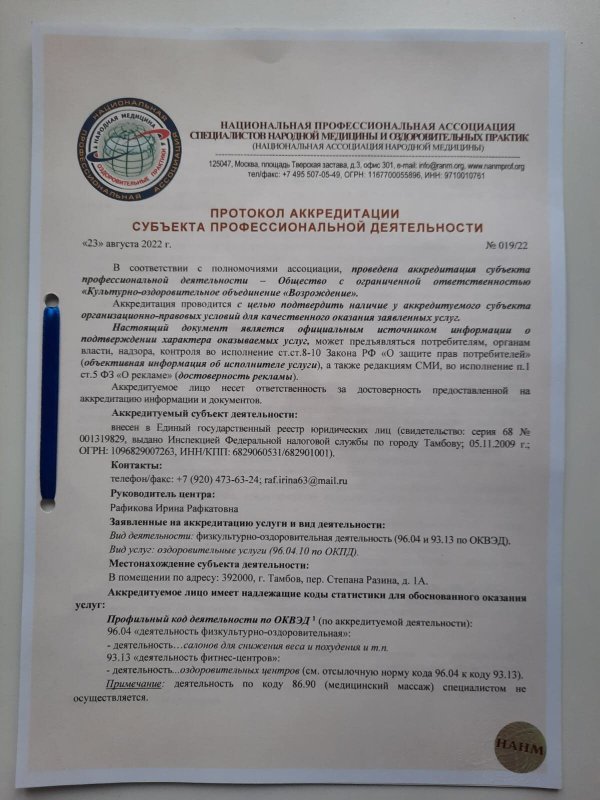 Приглашаем в оздоровительный центр Возрождение - место, где хорошо знают ценность естественной красоты и виртуозно умеют ее взращивать и поддерживать. Наше здоровье постоянно подвергается воздействию различных угнетающих факторов: выхлопные газы, стрессы и нездоровый режим питания, недосыпание и хроническая усталость... Все это пагубно влияет на внешний вид, и не во всех ситуациях косметика помогает исправить положение. В оздоровительном центре Возрождение вам помогут восстановить здоровье и сиять красотой, идущей изнутри!